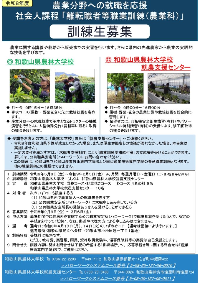 和歌山県農林大学校及び和歌山県就農支援センターでは、県内で新しく農業を始めたい社会人の方を対象とした就農研修を実施しています。いずれも受講料は無料です。